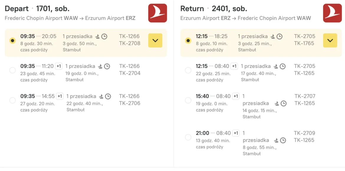 - Samolot – najlepsze połączenie to Erzurum – Warszawa lub Bratysława/Wiedeń – Erzurum